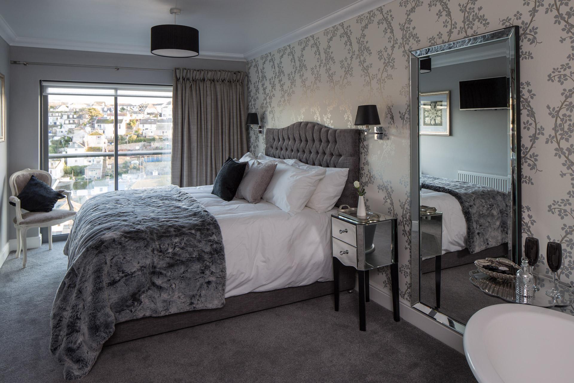 Super-king 6ft Hypnos Bed. Juliette Balcony. Bateau Bath in room. En-suite with walk-in shower. Sony HD Smart TV. South east facing with sea, harbour, town and countryside views.